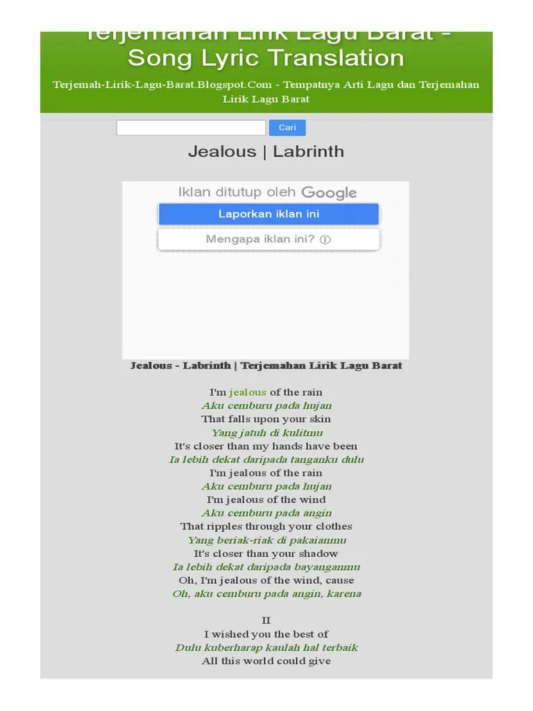 It's closer than my hands have been Terjemahan lirik lagu jealous dari labrinth. You got a new girlfriend but i still love you. Lagu ini yang didistribusikan oleh label sony music. Layanan mobile dari situs entertainment terbesar indonesia, . I don't like the way he's looking at you. That falls upon your skin. I'm jealous of the rain. Bianca jodie juga menyanyikannya di ajang indonesian . Anda punya pacar baru tapi saya masih mencintaimu. Pada setiap bait lagu ini menceritakan rasa iri yang sangat dalam dimana ia tidak bisa sedekat, senyaman, seseorang yang saat ini berada disamping perempuan . Lirik jealous dalam bahasa indonesia yang diterjemahkan secara manual tanpa mesin penerjemah di kemas dalam dua bahasa secara berurut. Lagu berjudul 'jealous' dipopulerkan oleh labrinth.